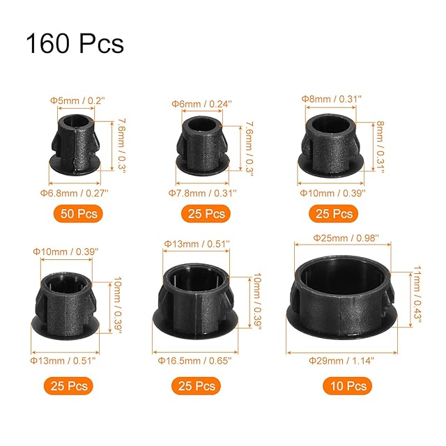 uxcell ナイロンプラスチックホールプラグ 160個セット 0.2"/0.24"/0.31"/0.39"/0.51"/0.98" 6サイズのホールプラグ パネルフラッシュタイプのノックアウトロックプラグ 家具キャビネット挿入エンドキャップ 黒