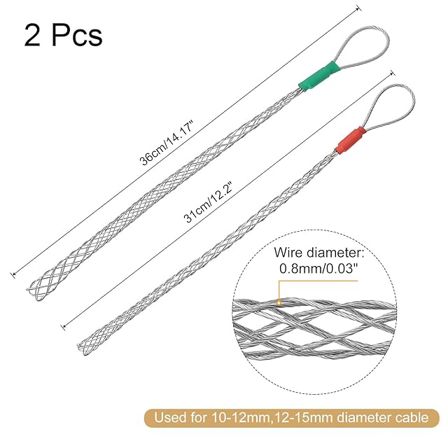 ワイヤープーラーソックスのサイズ::長さ:31/36 cm(12.2);線径:0.8 mm;直径:10-12 mm、12-15 mmケーブル用;カラー:レッド + 緑;材質: 亜鉛メッキ鋼;パッケージ内容:2 x シングルワイヤーメッシュプーラーソックスグリップ;