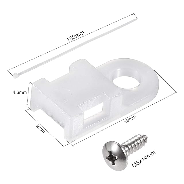 【サイズ】:ベース全体サイズ:19 mm x 9 mm x 4.6 mm(L * W * H); ケーブルタイサイズ:150 mm x 2.5 mm x 1 mm(L * W * H); パッケージの内容:合計50セットxネジとネクタイ付きのケーブルクリップ。