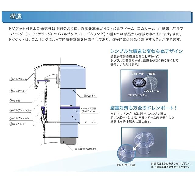 【シンプルな構造と変わらぬデザイン】通気弁本体の構成部分はわずか4点。シンプルな構造なので、長く安心してお使いいただけます。 ※Eソケット付ドルゴ通気弁は通気弁本体が4つ(バルブドーム、ゴムシール、可動盤、バルブシリンダー)、 Eソケットが2つ(バルブソケット、ゴムリング)の計6つの部品から構成されております。