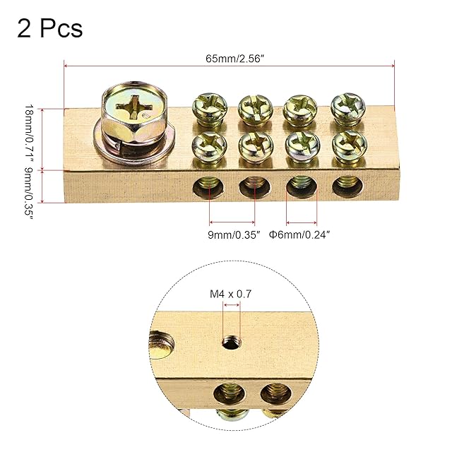 uxcell 銅バー アースターミナルブロック バリア端子台 真鍮 9ポジション 配電用 65mm x 18mm x 9mm 2個入り