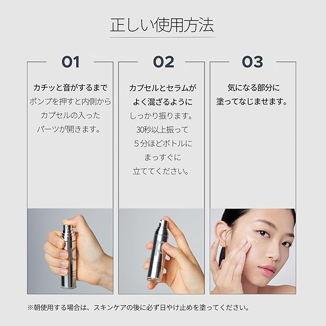 【使用方法】本商品はカプセルパートとセラムパートで分かれています。ふたを開け、カチッと音がするまでポンプを押してください。最初に使用するとき、上部の黄色いビタミンカプセルがレチノールセラムと配合されます。カプセルが溶けてセラムとよく混ざるように30秒以上、上下に振ってから5分ほど立てておいてください。 2~3プッシュの量で、顔全体になじませます。