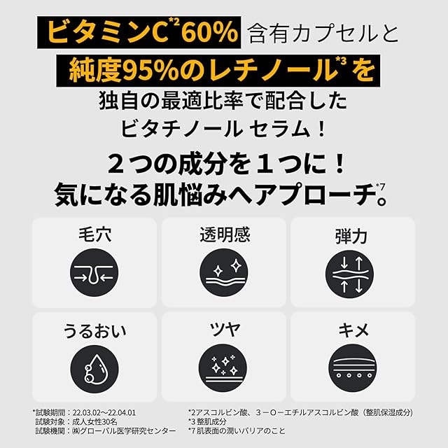 【ビタチノールセラム】 このレチノールとビタミンCのシナジー剤型は、肌の美しさをサポートし、毛穴やシワ、弾力などの肌の状態をケアすることができます。
