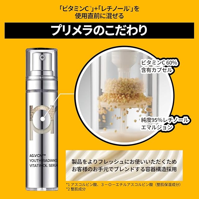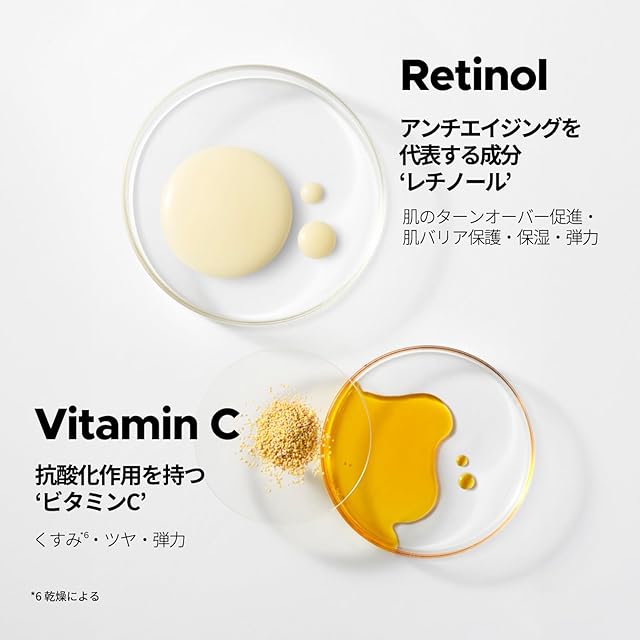【ビタミンC+レチノール】 ビタミンCカプセルとピュアレチノールの革新的な組み合わせで、高効能な成分が最大限に活用されます。
