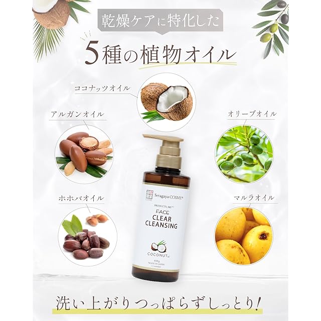 ✅【乾燥ケアに特化した5種の植物オイル配合】 世田谷コスメ クレンジングジェルココナッツは、乾燥ケアに特化した5種の植物オイルを使用しています。乾燥ケアに特化したココナッツオイル、アルガンオイル、オリーブオイル、ホホバオイル、マルラオイルが洗い上がりつっぱらずしっとりとした肌へとサポートします。