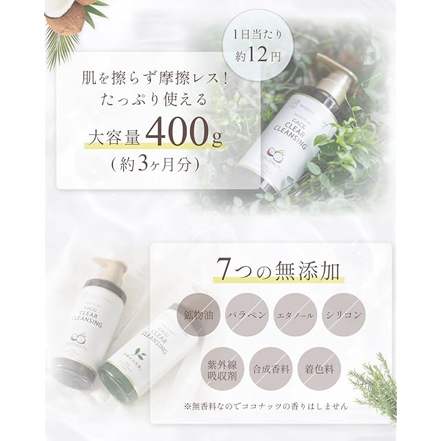 ✅【この1本でメイク落とし×洗顔】 世田谷コスメ クレンジングジェルココナッツは、W洗顔不要のクレンジングジェルです。 クレンジングと洗顔をこの1本で行えるため、マツエクや濡れた手でもご使用できます。 毎回たっぷりと使っていただける大容量の400gで約3ヶ月使用できるコストパフォーマンス抜群のクレンジングジェルです。