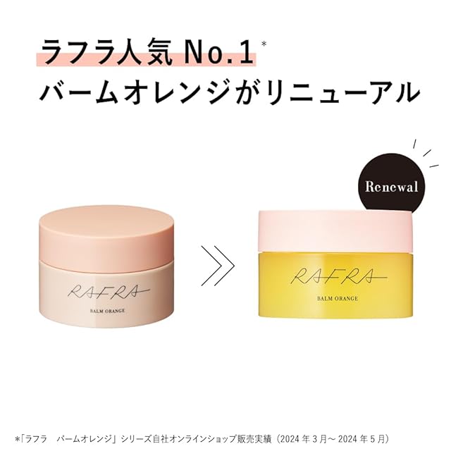 美容液で洗うという発想のもと、ラフラ独自の設計により「汚れを落とす」+「うるおいを与える」=「洗いうるおす」を両立した、ラフラで人気NO.1*の温感クレンジングバームです。<br>*「ラフラ バームオレンジ」シリーズ自社オンラインショップ リニューアル前商品の販売実績(2022年10月~2023年9月)<br><br>天然由来成分99%以上配合<br>2024年のリニューアルで、天然由来成分99%以上配合を実現しました。洗浄成分も植物由来にこだわっているから、オイル級のクレンジング力なのに肌にやさしい使用感です。<br><br>美容液成分92%※配合<br>2024年のリニューアルで、新たに美容液成分をプラス。美容液成分※のかたまりで洗っているような、贅沢クレンジング体験で感動の洗い上がり。メークや毛穴汚れを落とすだけではなく、洗うたびにうるおいに満ちた肌へ整えます。<br>※保湿・エモリエント・皮膚コンディショニング成分の合計、水を含む<br><br>+8℃*の温感バームが肌をほぐし*1て汚れを落とす<br>リニューアル前のバームオレンジの良さはそのままに、じんわりとろける温感バームが、固くこわばった肌をほぐし*1、肌に負担をかけることなくメークや毛穴の奥の汚れ・くすみ*2・皮脂汚れまでしっかり絡め取ります。加えて、リニューアル後は角栓除去効果がパワーUP★。毛穴に詰まった頑固な角栓をスッキリ落とし、洗い上がりはザラつきのないなめらかな肌に。<br>★人工角栓洗浄試験結果より *室温24.7℃で保管した本製品を肌の上で塗り広げた際のバーム表面の温度差 *1肌を柔らげます *2古い角質や汚れ<br><br>より柔らかくなったバームが摩擦レス*に汚れに密着<br>2024年のリニューアルで、テクスチャーがより柔らかくなりました。肌にスルスル広がり、頑固な毛穴汚れもメークも摩擦レス*に絡めて落とします。また、ジャー容器は半透明に変わり、一目で中身が分かるようになりました。<br>*柔らかなバームがクッションとなり、肌をこすらない洗い方のこと<br><br>心まで洗う、もぎたてのオレンジのような香り<br>人工香料は一切使わず、2種類の天然オレンジオイル※を独自にブレンドした、もぎたてのようにフレッシュで、みずみずしい香りです。心地良い香りに包まれ、リラックスしながらクレンジングを楽しんでほしい、そんな願いが込められています。<br>※香気成分<br><br>環境に配慮した取り組み<br>個装箱は環境に配慮した紙を採用。また、プラスチック削減にも着目し、これまで付属していたスパチュラを取りやめました。クレンジングを通じてサスティナブルな未来への一歩を踏み出します。