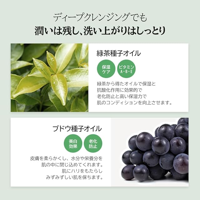 【潤い残し洗い上がりしっとり】緑茶種子オイルやブドウ種子オイル配合だからディープクレンジングでも肌に必要な成分は残すから潤いは残したまま洗い上がりはしっとり