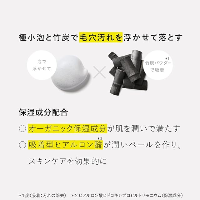 *1 炭(吸着:汚れの除去) *2 角質層まで *3 ヒアルロン酸ヒドロキシプロピルトリモニウム(保湿)