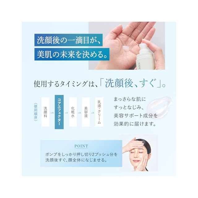 【使用順序】 クレンジング ⇒ 洗顔 ⇒ コアエフェクター ⇒ 化粧液 ⇒ (美容液) ⇒ 乳液 ※朝晩のお手入れにご使用いただけます。