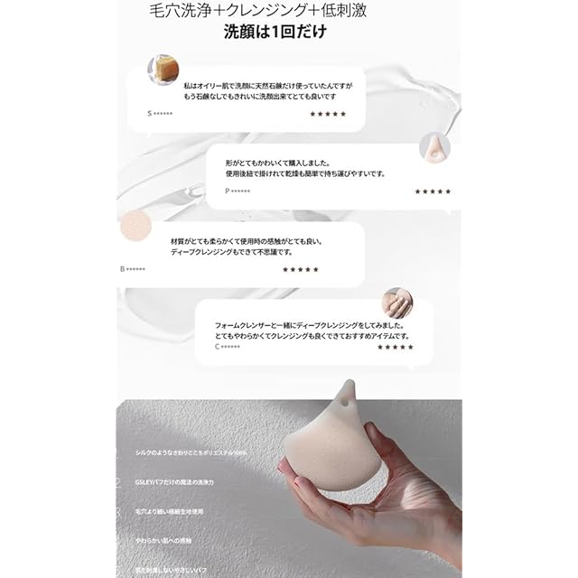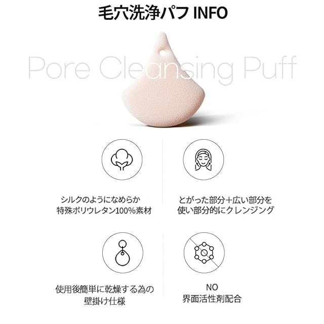 ✅ 【 特徴 】 ■ 「GSLEY毛穴洗浄パフ」は、毛穴の中の汚れを水で優しく落とすためのアイテムです。 ■ このパフは、特殊ポリウレタン100%素材で作られており、シルクのようになめらかな肌触りです。 ■ パフには尖った部分と広い部分があり、それぞれ適した部位でクレンジングできます。 ■ 使用後は壁掛けできる仕様で、乾燥しやすくなっています。また、界面活性剤は配合されていません。