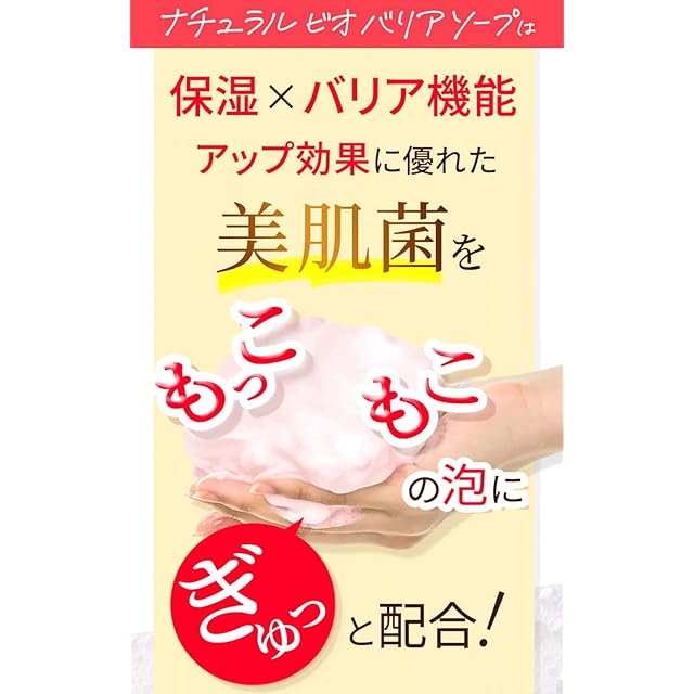素肌力を高める美肌菌発想の洗顔石鹸:ナチュラルビオバリアソープは4種の美肌菌由来成分を閉じ込め、素肌力を高めることに着目。もっちりと濃密な泡が毛穴に密着し、肌にやさしくしっかりと汚れを吸着しながら、同時にうるおいを高め、しっとりつるんとした肌触りへと仕上げます。うるつる仕上げで素肌力アップ!ストレスフリーな肌へと育てる濃密洗顔石鹸です。保湿×バリア機能アップ効果に優れた美肌菌に着目:近年話題の「美肌菌」をもこもこの泡にぎゅっと配合!プロバイオティクス*1、プレバイオティクス*2を配合し、なめらかでストレスフリーな肌へと導き、トラブルに負けない肌の土台*3作ります。*1ビフィズス菌培養溶解質、ヨーグルト液 *2ラフローラK‐1、バイオエコリア *3角質層