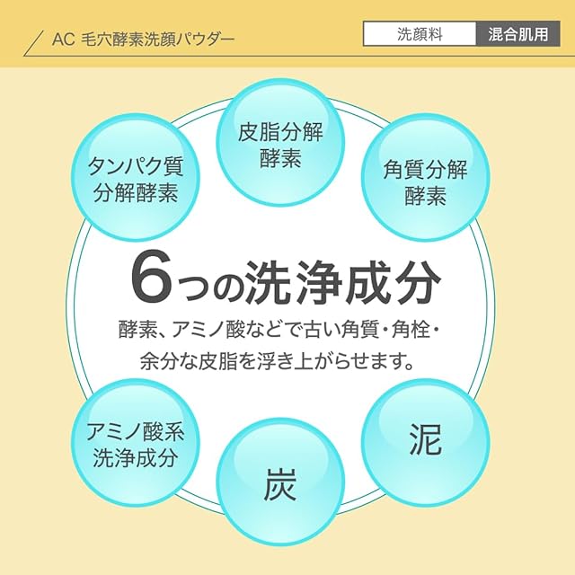 ✅ 頑固な角栓・角質を取り去る3種の酵素(タンパク質分解酵素(*)・皮脂分解酵素(*)・角質分解酵素(*))で「くすみ・黒ずみ・ざらつき」を解消し、 肌のキメを整える酵素パウダーです。 *整肌成分