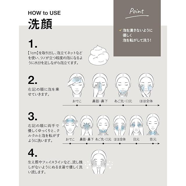 ✅【 使用方法 】(適量:1cm) 適量を清潔な手に取り、メレンゲ状の泡になるまで泡立てます。泡で顔を包み込むようにして洗います。水またはぬるま湯で泡が残らないよう十分に洗い流します。