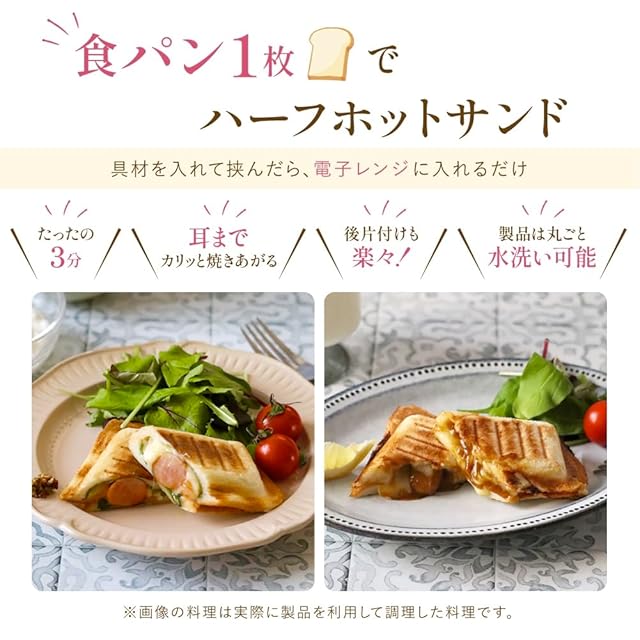 食パン6枚・8枚切り対応、わかりやすいレシピブック付き。食パン1枚で簡単ハーフホットサンド!たったの3分で耳までカリッと焼きあがる♪具材を挟んだらレンジに入れるだけ。