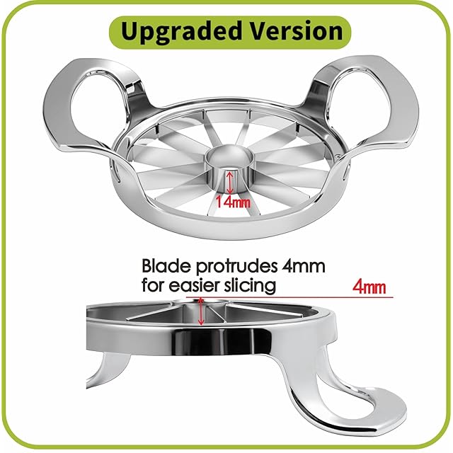 [最新バージョン]アップグレードされた4.75インチ、12枚のブレードが付いた特大アップルスライサー。 内径4.1インチのブレードは、360°シームレス強化溶接で、センターコアリングにしっかりと固定されています。 溶接面積は大きく、より強力です。 亜鉛合金のハンドルと刃は304ステンレススチール製で、最もシャープなフルーツカット体験を提供します。