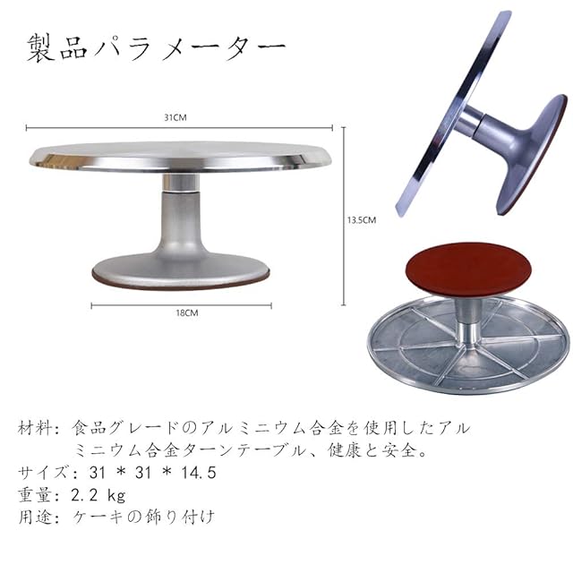 素材:食品レベルアルミ合金を採用し、洗練された研磨プロセス、滑らかで滑らかな表面。抗菌および防食、ケーキ作りにも安心!耐久性がよく、長期にわたってご使用いただけます。回転台直径:31cm 高さ:13.5cm 台座直径:18cm 重量:1.7kg PVC滑り止めマット付き。