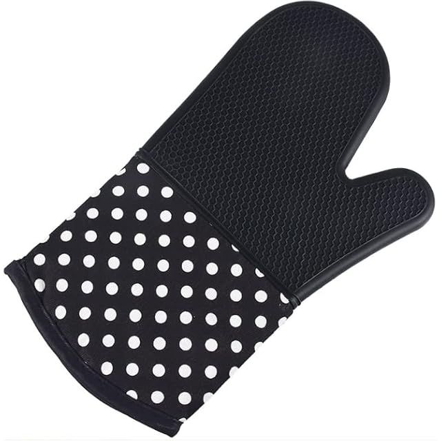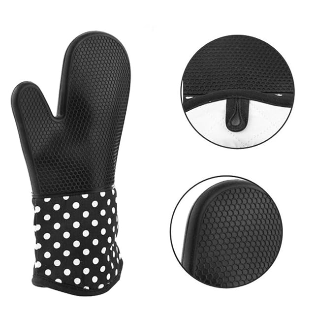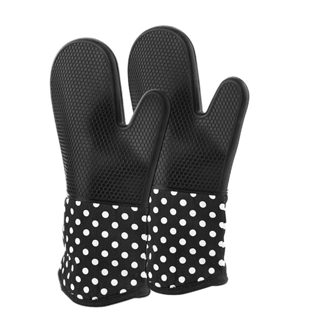 断熱オーブンミトン シリコン手袋 300℃ 耐熱ミトン 業務用 オーブンミット 滑り止め 厚手 手保護手袋 熱くない 鍋つかみ 調理用手袋 おしゃれ キッチン手袋 電子レンジ オーブン バーベキュー BBQ 2枚セット ドット柄 デザイン ブラック