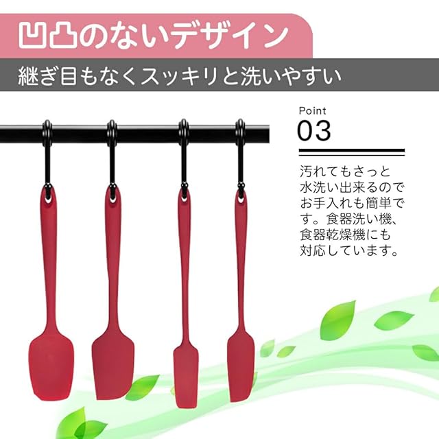 「シームレスなデザイン」:柄とへらが一体成型で、継ぎ目がないで汚れが溜まらず衛生に使えます、さらにお手入れしやすくなりました。柄には引っかけるのに便利な穴付きなので収納もしやすいです。