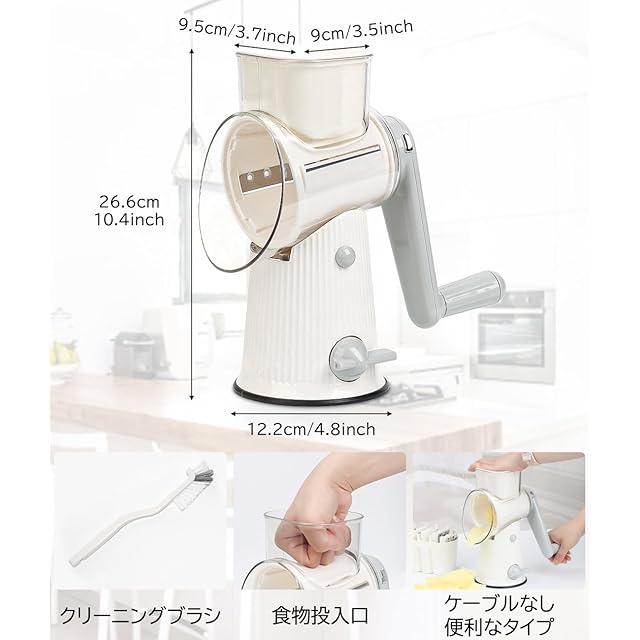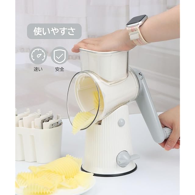 【操作安全】 スライサー 千切りは安心してお使いください。安全で、キッチン初心者でも簡単に操作できるキッチン用品です。①①電源は不要で、ハンドルを振って野菜を切ったキャベツ千切りスライサー。②台座には吸盤が追加され、キッチンの天板に固定することができ、スリップ防止する。③端っこの野菜を操作する際に手と刃が接触しないようにするハンドガード付き。④全閉ドラムで動作します。これらの設計特徴により、セキュリティ性能が大幅に向上しました。誰でも簡単に使えるこのスライサー 調理器具は、手間を省くだけでなく楽しみもたくさんあります。⚠ヒント:野菜 スライサーの刃が鋭いので、野菜スライサーを取るときは注意してください。