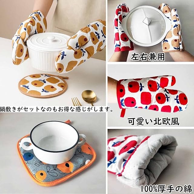 【可愛い北欧風デザイン】プリントされた柄が可愛らしく明るかった、デザインも可愛くしっかりと耐熱してくれます。おしゃれ感と存在感のある花柄に北欧っぽさが。鍋敷きがセットなのもお得な感じがします。