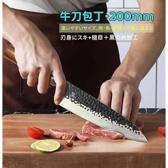 VGTEN 牛刀 ステンレス 牛刀包丁 刃渡り20cm 黒染め 槌目 マホガニー柄 和包丁 肉・魚・野菜など万能に使える 両刃 業務 家庭用 料理包丁