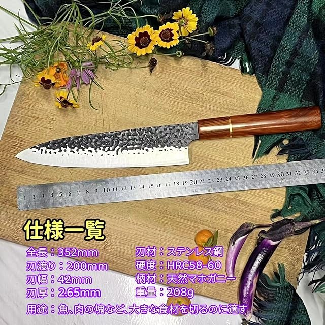 【仕様】サイズ:全長352mm/刃渡り200mm/刃幅42mm/刃厚2.65mm。材質:刃材ステンレス鋼/硬度HRC58-60/柄材天然マホガニー。重量:約208g。両刃仕様、用途:魚、肉の塊など、大きな食材を切るのに適す。
