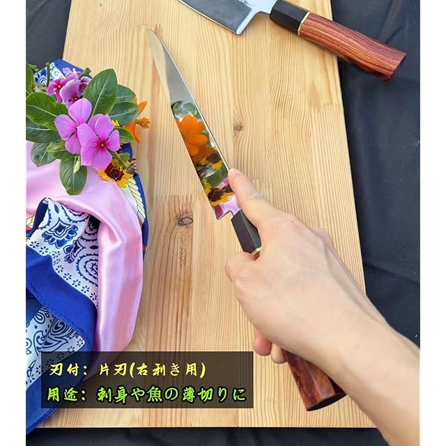 【特徴】刃をやや細く長くして捌きから刺身を引くまで一本で間に合わせようとする方に向いている包丁です。切れ味がよく、手入れしやすいステンレス鋼製で、刺身や魚介類の薄切りなどにぴったりで、プロも納得の使い心地が魅力です。