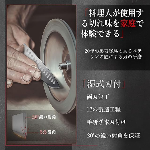 【鋭い刃&デポット加工】15°の角度で12ステップのウェット手動刃先プロセスを採用し、食品への切断抵抗を低減、食材への切り込みの良さと鋭い切れ味を実現しています。デポット加工により、食材と刃の接触面積と食材への抵抗が減り、切れ味が向上するとともに、分離が良く、食材が包丁にくっつきにくくなります。