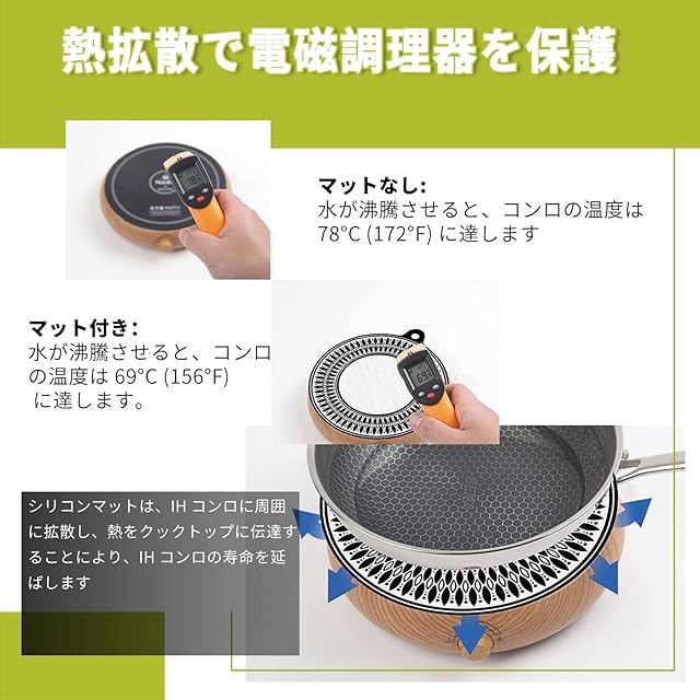 【ihクッキングヒーターの保護に最適】IHを使っていると、黒ずみができ、それを落とすのがけっこうやっかいなのですが、本製品を敷くことで保護できる。表面はシリコンシートに黒ずみが出来ます。IHの面には黒ずみが出来ません。直接調理器具がIHに接しないので黒ずみ防止には役立つようです。鍋底がIH調理器表面に当たるとき、本商品を載せているとクッションのようになるので、磁器がぶつかるような音がは出ない。単に汚れ防止だけでなく電磁波の分散になるらしく家電を長持ちさせる効果もある 。