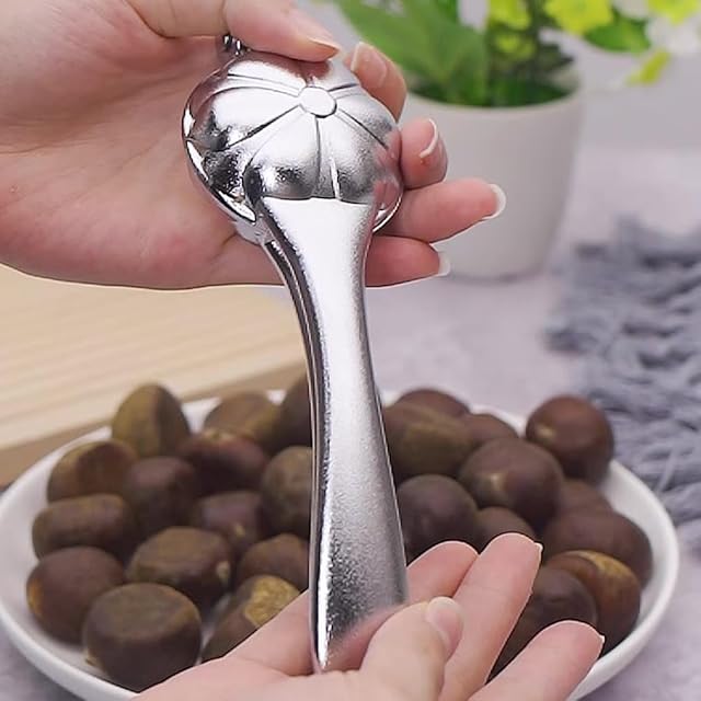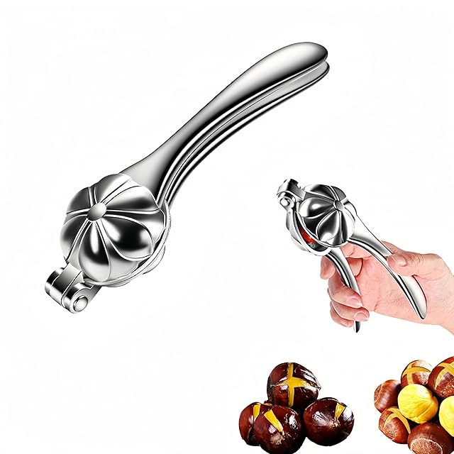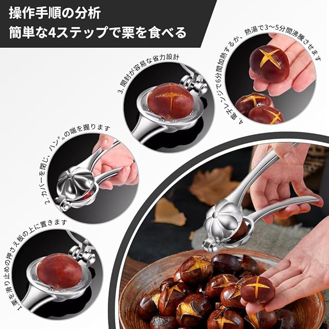 この栗むき器は、銀合金材質と鋭い十字鋸歯を持ち、杠杆原理とエルゴノミックデザインの握把により、一秒で省力して簡単に開口できる新しい定義の多機能ツールです