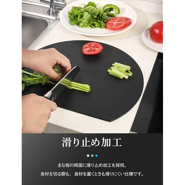 かんたん洗浄...表面が滑らかで洗いやすいため、 汚れを残さずかんたんに洗い流せます。 また、表面の汚れは直接拭き取ることもできます。切った食材を移動できる一 丸型スペース。作業スペースを効率よく使える。[かまぼこ型]の使いやすいフォルム。Point 1. 奥行きがあって広く使いやすい丸形部分。Point 2. 食材が切りやすい、手前のフラット部分。