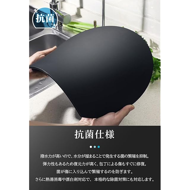 130℃の耐熱に対応しているため、食洗機の使用が可能。また、熱湯消毒もできるため本格的な除菌対策もOK。 抗菌仕様。撥水力が高いので、水分が溜まることで発生する菌の繁殖を抑制。弾力性もあるため復元力が高く、包丁による傷もすぐに修復。菌が傷に入り込んで繁殖するのを防ぎます。さらに熱湯消毒や漂白剤対応で、本格的な除菌対策にも対応します。