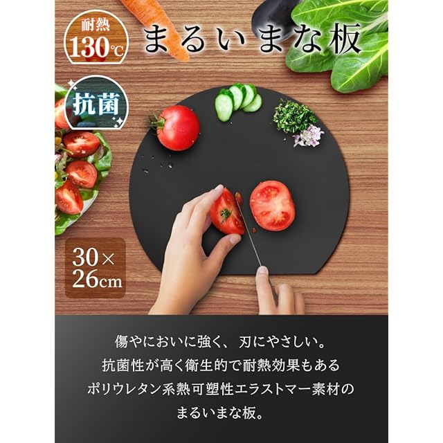 耐熱130度!傷やにおいに強く、刃にやさしい。 抗菌性が高く衛生的で耐熱効果もある。ポリウレタン系熱可塑性エラストマー素材のまるいまな板。