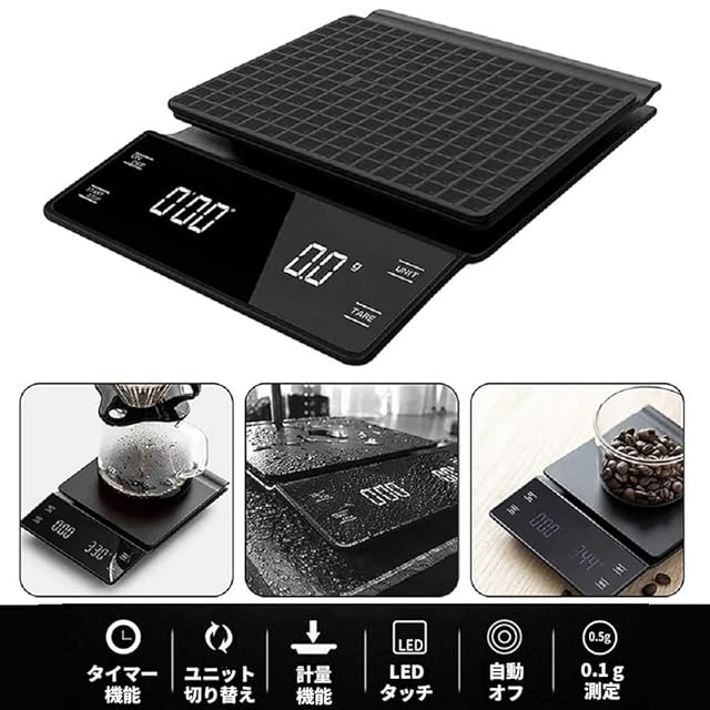 ☕【タイマー機能&風袋引き機能】分秒最大を表示、時間は最大99分59秒。美味しいコーヒーを淹れるには抽出量と抽出時間の測定が不可欠です。風袋引き機能、自動校正、オートパワーオフなどの機能を揃えるデジタルスケールです。