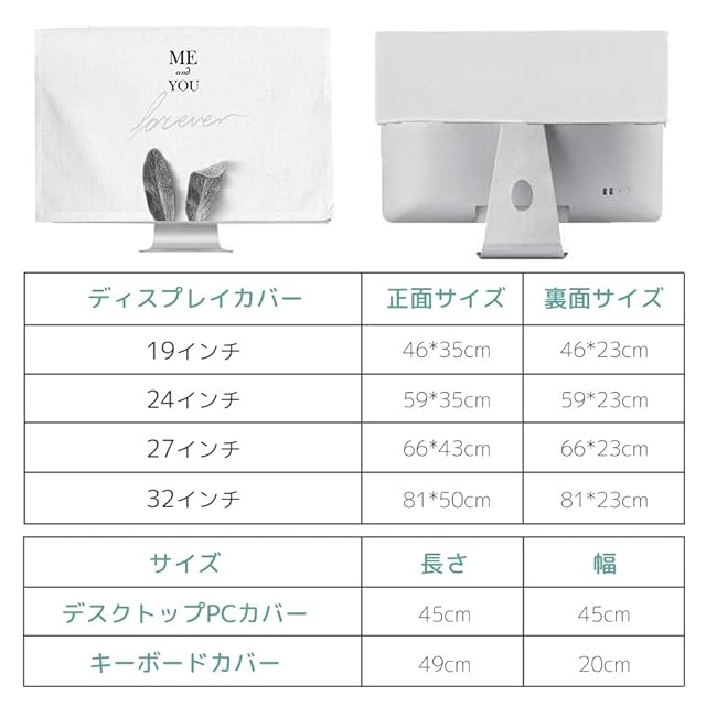 【サイズ】ディスプレイカバー:19インチ(46x35cm)、24インチ(59x35cm)、27インチ(66x43cm)、32インチ(81x50cm) デスクトップPCカバー:45x45cm キーボードカバー:49x20cm