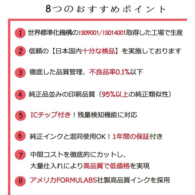 国際標準認定: 当店で扱う互換インクカートリッジは、ISO14001(環境)、ISO9001(品質マネジメントシステム)国際標準化機構認定工場と最新の設備によって、厳しい品質管理のもと1つ1つ丁寧に製造している、高品質と高い信頼性の互換インクカートリッジです。 提携する工場は取得した基準:ISO9001、ISO14001、SGS、世界基準STMC、ヨーロッパ基準CEなど。