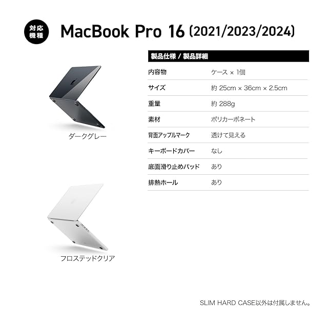 【製品仕様】… ◆ 対応機種 : MacBookPro16 2024 2023 2021 2020 ( M4 Pro M4 Max M3Pro M2Pro M2Max M1Pro ) ◆ 内容物 : ケース × 1個 ◆ サイズ : 約 35.8cm × 24.5cm × 2cm ◆ 重量 : 約 278g ◆ 素材 : ポリカーボネート