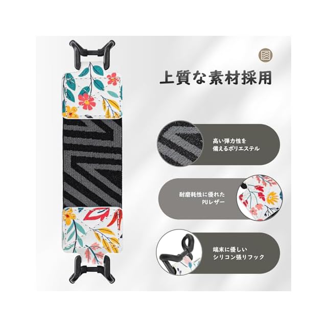「上質な素材採用」 メイン素材は高い弾力性を備えるゴムを採用しており、ゴムの肌触りも張りもちょうど良く、手にしっかりフィットしてくれます。端末を引っ掛ける部分にはクッション性に優れた柔らかいシリコン素材を使用し、端末を傷つけずにしっかりと掴んでくれます。