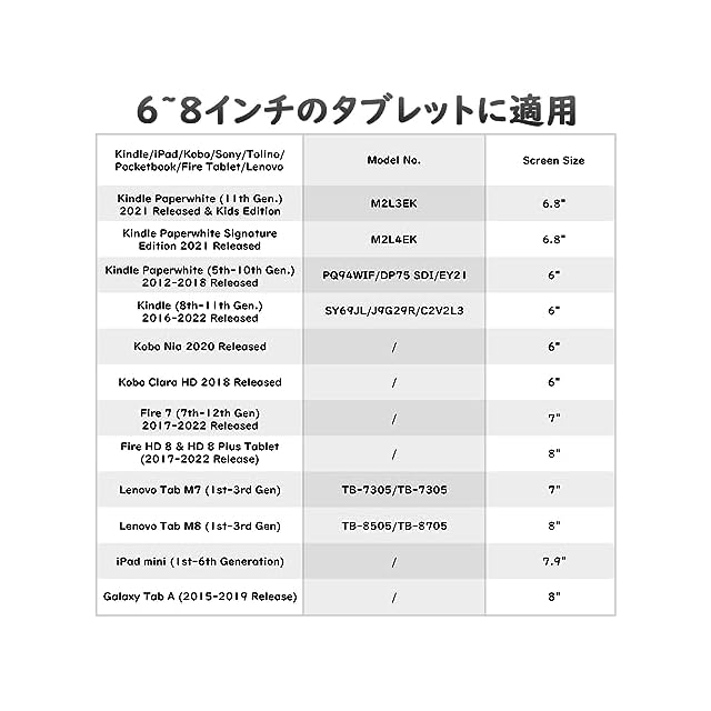 「機種幅広く対応」弾力性の高いゴム製のため、iPad Mini 第7/6/5/4/3/2/1世代、Kindle Paperwhite 2024/2021/2018、Fire7 2022/2019、Fire HD 8 & 8 Plus 2024/2020など等6~8インチタブレットに幅広く対応しております。厚めの保護ケースを付けられた場合は本製品を取り付けられない可能性がありますので、保護ケースを外して、または薄型のケースを付けて本製品をご利用ください。
