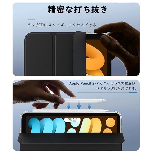 「三折りスタンド式」三つ折りのフロントには、複数のマグネットが均等に内蔵されています。ご大切なiPadを立てて使用する際にしっかりサポートし、安定した角度を維持したまま快適にお使いいただけます。Pencil USB-C(iPad Mini A17 Pro & iPad Mini6 用)の磁気吸着、Pencil Pro(iPad Mini A17 Pro 8.3インチ用)及び Pencil第2世代(iPad Mini6 8.3インチ用)のワイヤレス充電に対応できます。