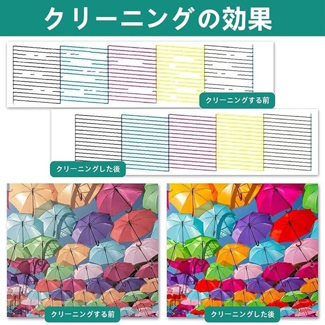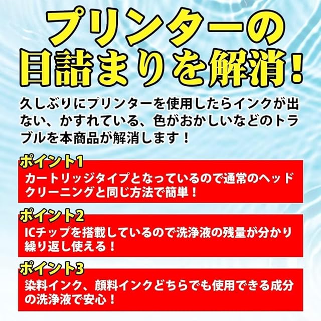 【製品仕様】当製品は洗浄インクとなりますが、純正品がインクの残量表示機能・ICチップ付きの商品は同じ仕様で、通常のインクカートリッジと同様のセット方法です。洗浄カートリッジのご使用後は何度か印刷する事で通常のインクが循環していきます。クリーニング後の最初のうちは色が出にくい事がございますが、洗浄液が残っている場合があるのでご確認の程お願い致します。※物理的な傷や損傷がある等の場合は、本製品では印字不良を改善することは出来ません。