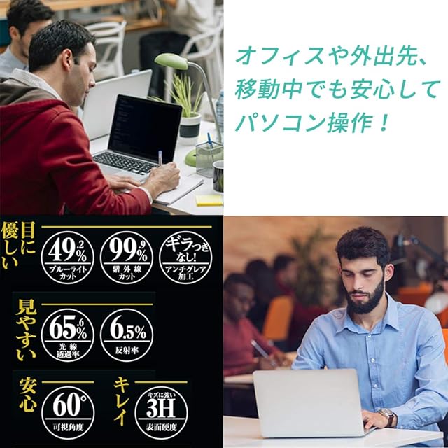 【反射軽減】反射率は6.5%なので日光や照明などによる反射を軽減することができます。のぞき見をしっかりガードしつつ、透過率は程よい65%にしているので、ずっと装着したままパソコンを使用していても違和感がありません。