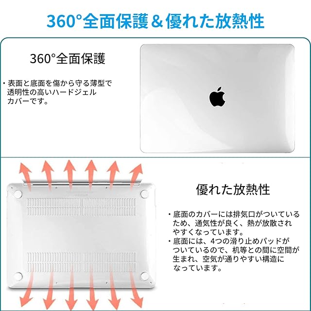 シンプルなデザイン:上下のカバーが分離しており、単体での使用も可能。表面のマークは透けて見えるデザインで、MacBookの美しさをそのまま楽しめます。実機に基づき作られており、本体の開閉に影響することありません。