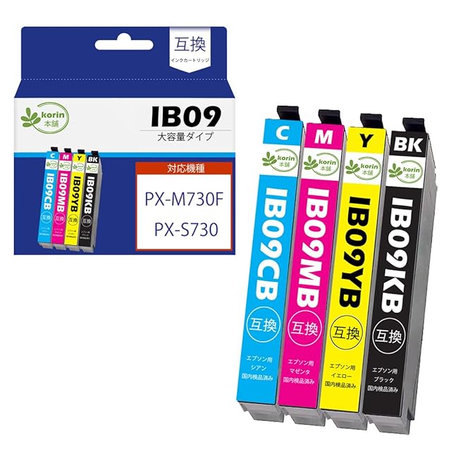 【korin本舗】IB09CL4B 互換インクカートリッジ エプソン(Epson)用 プリンター インク IB09 電卓 4色セット(IB09KB IB09CB IB09MB IB09YB)(合計4本) 増量 説明書付 残量表示 個包装 PX-M730F PX-S730
