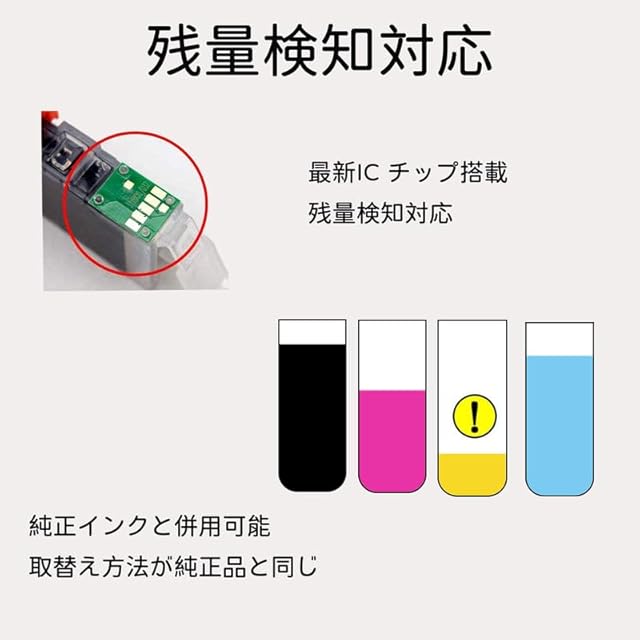 【高性能】残量検知に対応するICチップ搭載しますので、純正インクと併用も可能です。個別包装で長期保存に適しています。一本ずつ箱に入っていますので、破損やインク漏れなど不具合の状況も有効に抑えます。