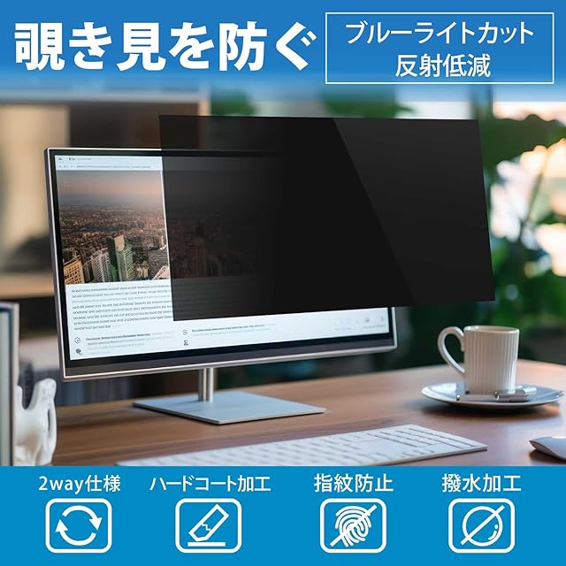 ★プライバシー保護:正面からの視認性を保ちつつ、側面からの覗き見を防ぐことができます。約60度の視野角(左右30度)を越えると、画面が暗く表示されるため、新幹線やカフェで作業をしていても情報の漏洩リスクを回避することができます。 フィルターの寸法:24インチ 16:9 フィルターの寸法:532mm x 297mm