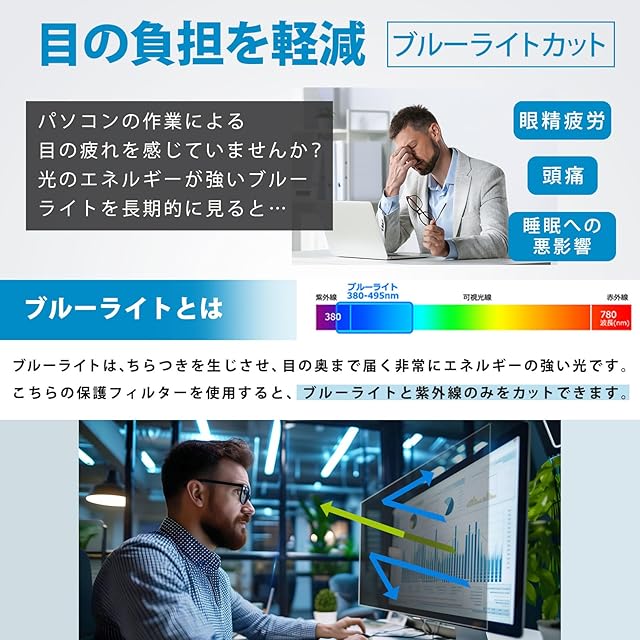 ★ブルーライトカット:ブルーライトを約48%、紫外線を99%減少させます。 ★傷から画面を保護:フィルターの硬度は3Hの硬度なので、傷から画面を守ることができます。