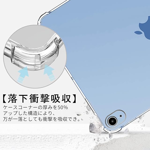【衝撃吸収】四隅がエアクッション構造,ケースのコーナー内側部分に落下時の衝撃を効率よく吸収するための技術を採用し、本体の落下時に伝わる衝撃を吸収し、 タブレットへ衝撃を最小限に抑えます。