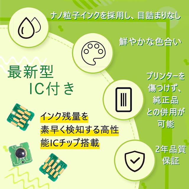 ★【詰まりなし】:粒子の細かいインクを採用しているため、耐久性、耐光性、着色力に優れています。プリンターヘッドの目詰まりを防ぎ、スムーズに印刷でき、速乾性に優れ、汚れが残りません。純正インクに劣らない高品質を実現し、純正との併用が可能です。